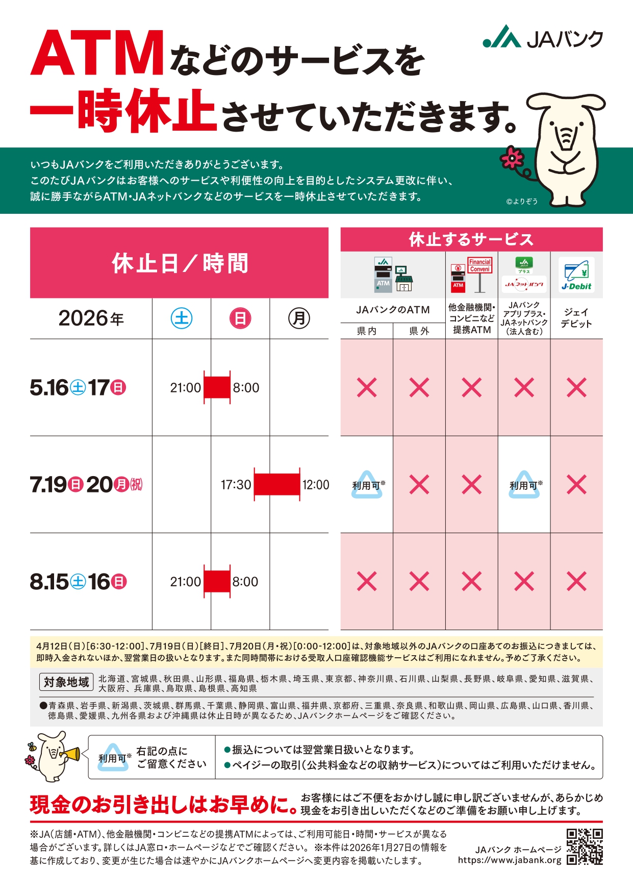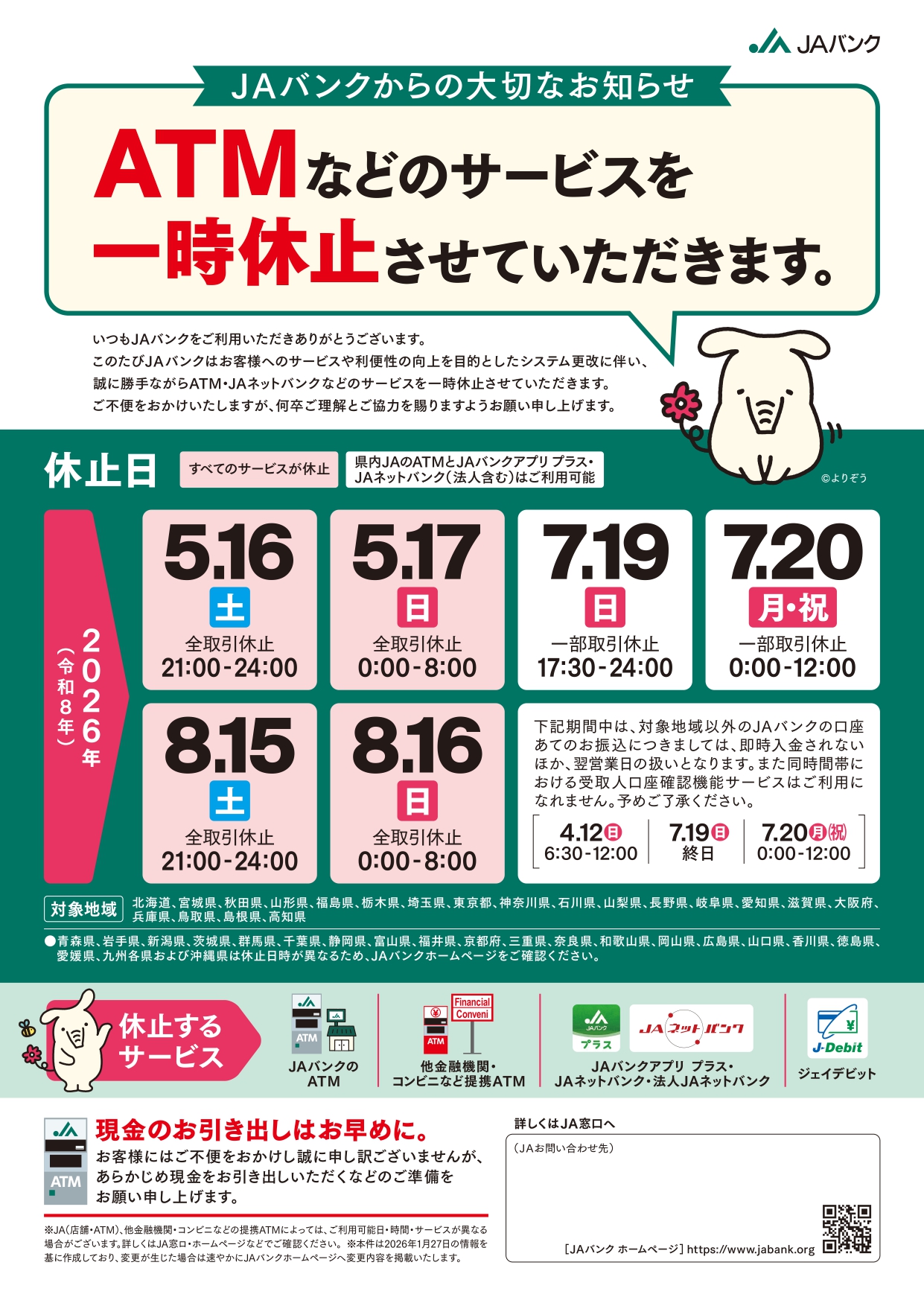 この度JAバンクはお客様へのサービスや利便性の向上を目的とした更改に伴い、誠に勝手ながらATM・JAネットバンクなどのサービスを一時休止させていただきます。