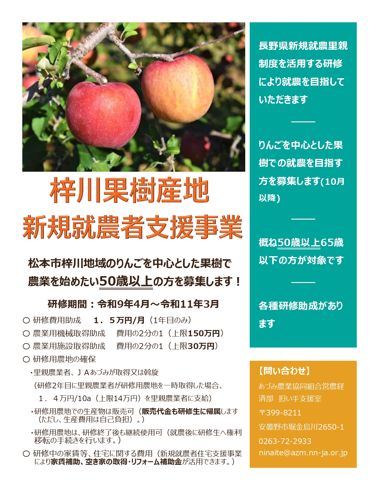令和9年度 梓川果樹産地新規就農者支援事業研修生募集について